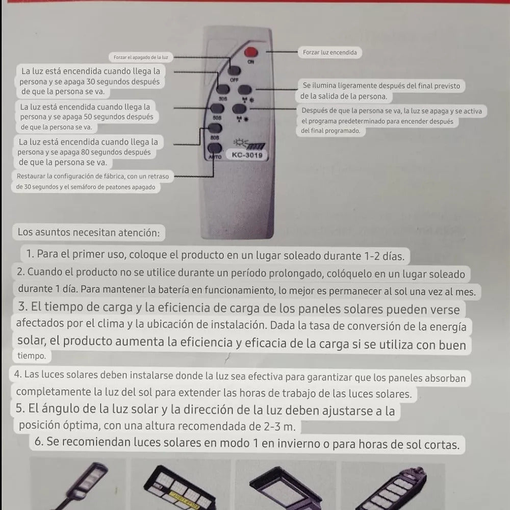 A prueba de agua: IP65Panel solar: 6V - 25WAutonomía: 3.2v - 20000mahTiempo de carga: 6-8 horasLuz FríaLentes de Policarbonato Cristal DWÁngulo de instalación sugerido: 15Iluminación: (3000-6000 K°)- 40000 lmFactor de potencia: 0,989.Tolera variaciones voltaje sin daño o cambio de brilloMedidas del foco- Largo 33 cm- Ancho 15 cm. Medidas del panel solar- Altura 32 cm- Ancho 14 cmControlado y configurado por control remotoLongitud del poste: 17 cm SOPORTEAlimentación del control remoto baterías AAA ( Incluidas ) *Nota importante: Para hacer funcionar el control primero debe encender el foco para que se configure el control remoto.En la ultima imagen se muestran las configuraciones con el control remoto.
